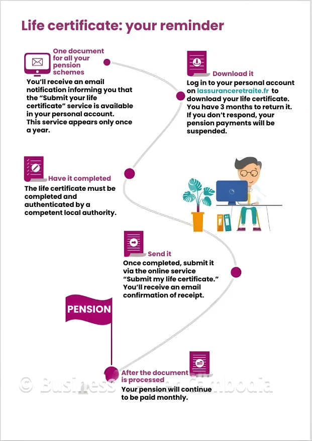 People living abroad who receive a pension from their home country’s retirement fund are often required to provide yearly proof that they are still alive. Retirees residing in Cambodia receive each year, by email, a pre-filled Proof of Life (or Existence) Certificate. After checking the information, they must book an appointment at their country’s consulate or embassy in Cambodia to have the document validated. Once validated, the certificate is simply uploaded online to ensure the uninterrupted payment of their retirement pension while living in Cambodia.